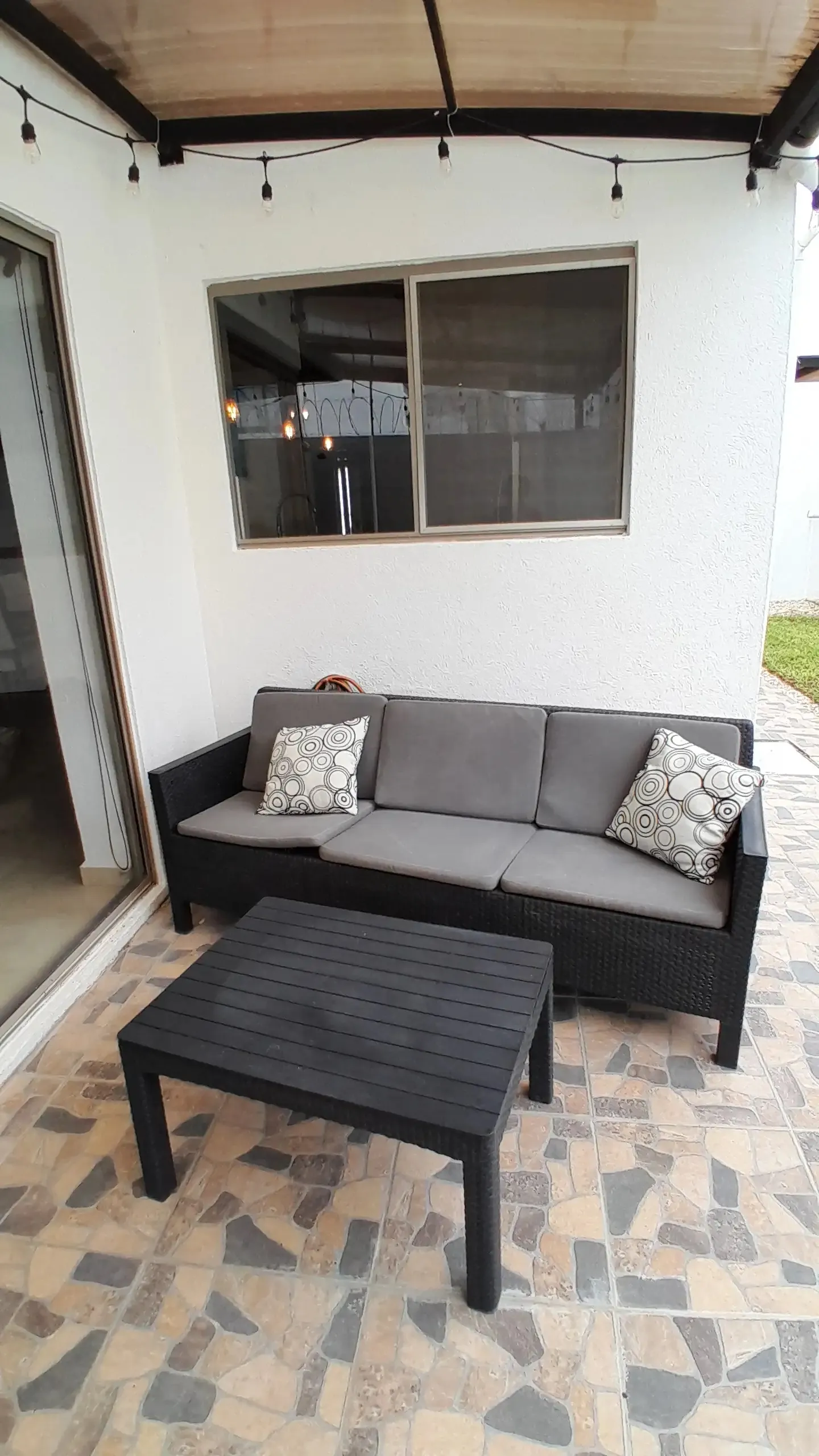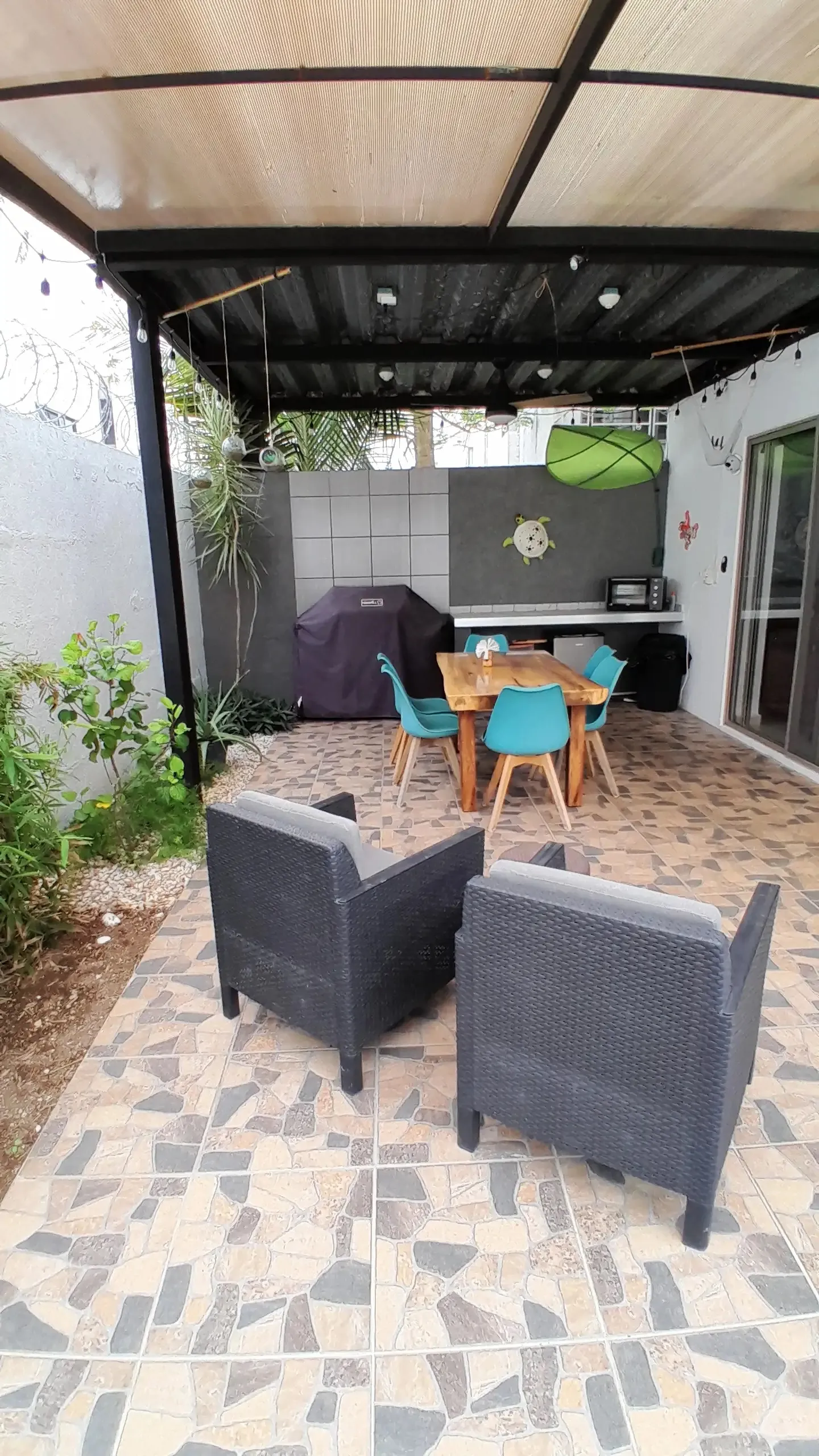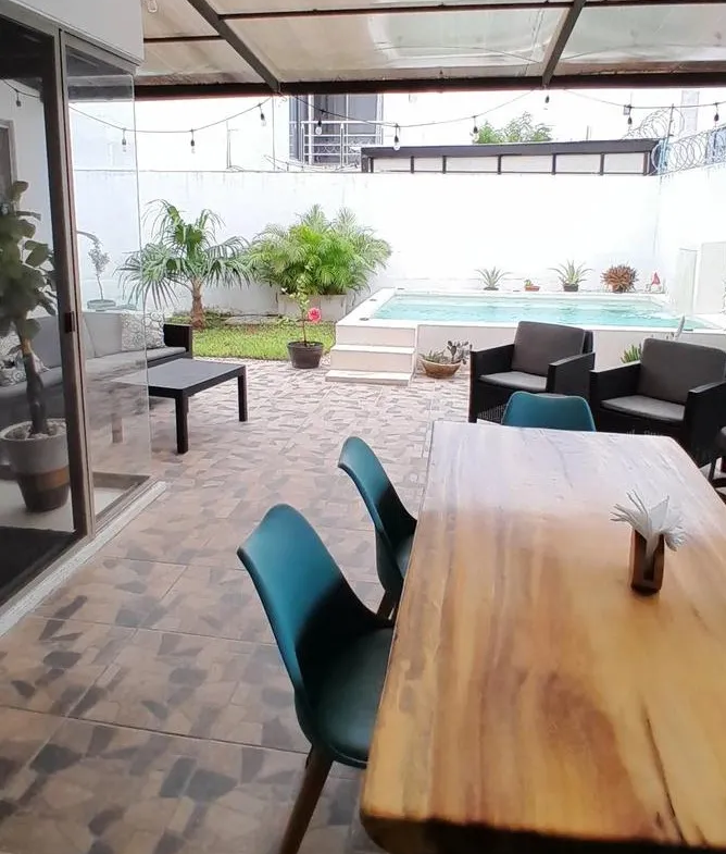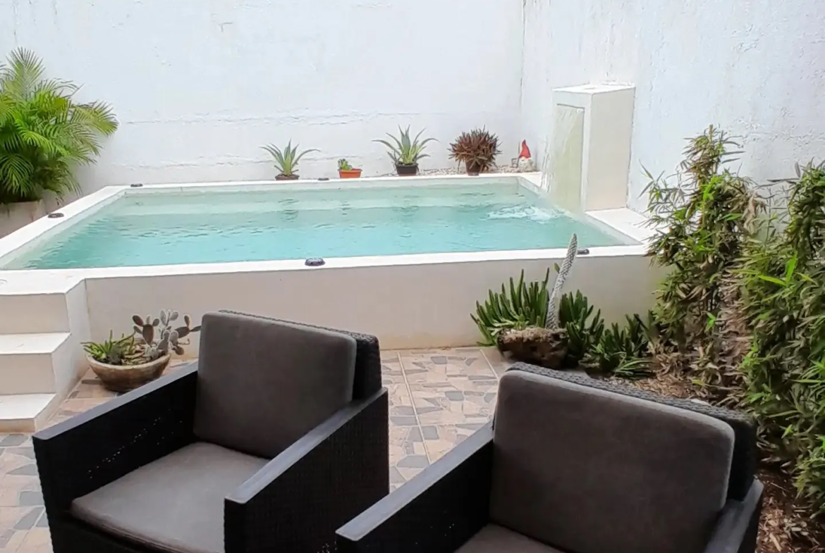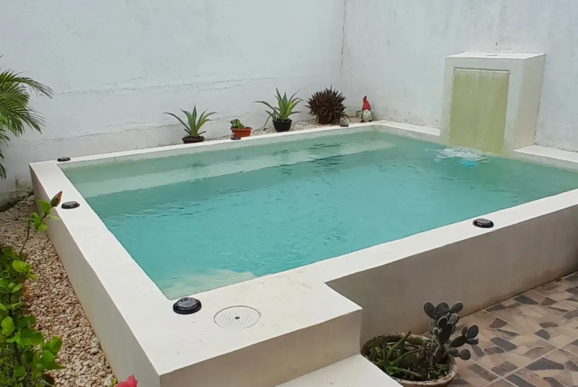 El patio trasero es un remanso de paz con alberca con chukum iluminada, terraza con pérgola y jardín. La casa cuenta con 10 paneles solares y cinco climatizadores para máxima eficiencia energética y ahorro.