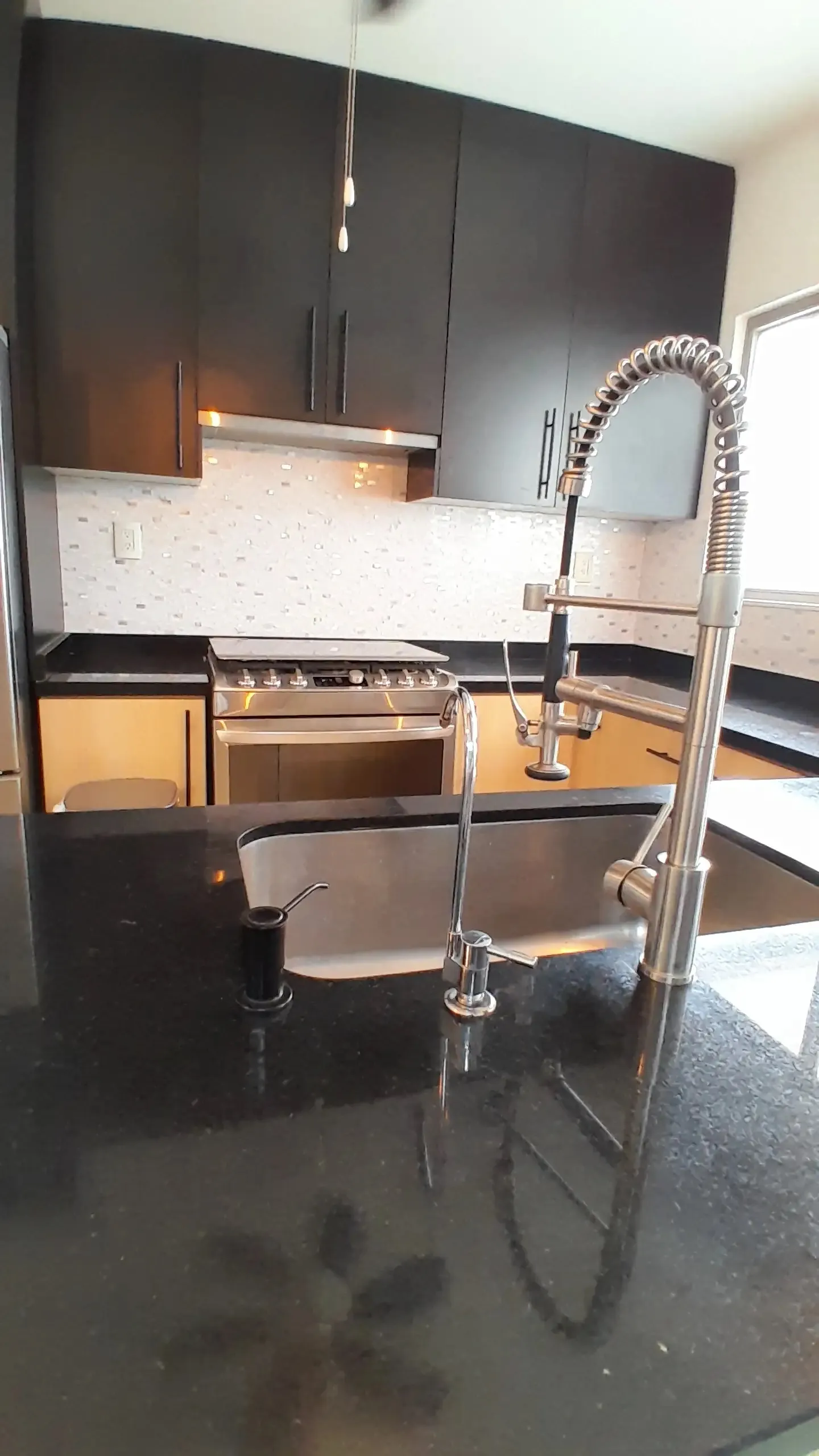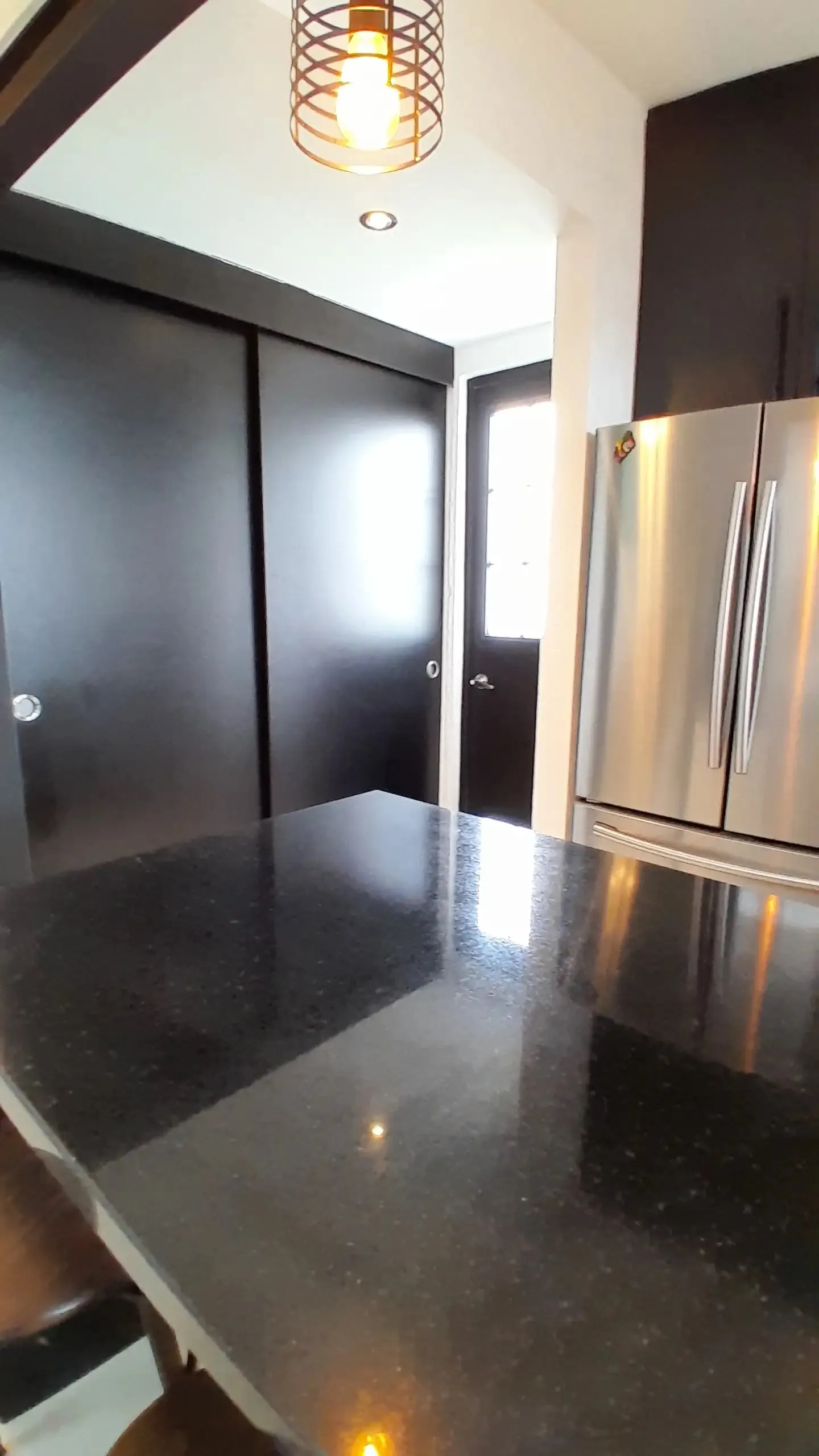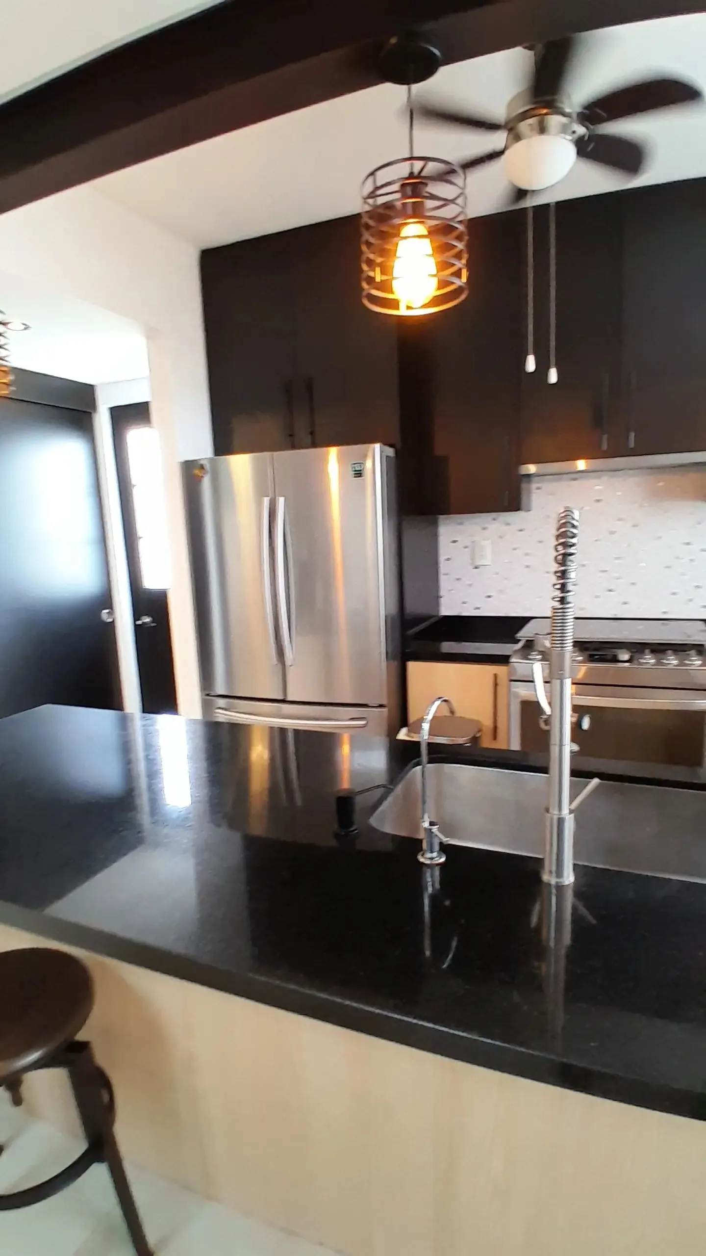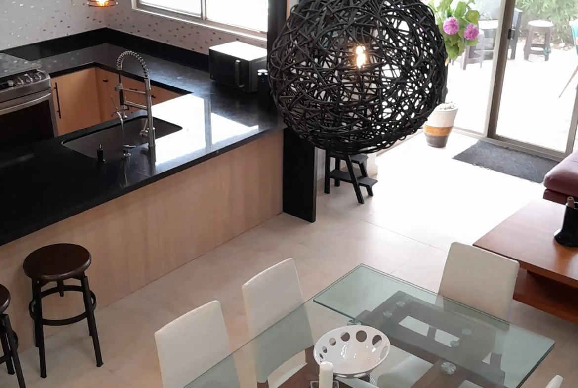 Planta Baja: Entrada, sala de TV o despacho, amplio salón-comedor que se conecta a una terraza techada, y una cocina gourmet con barra de granito negro y sistema de agua potable.