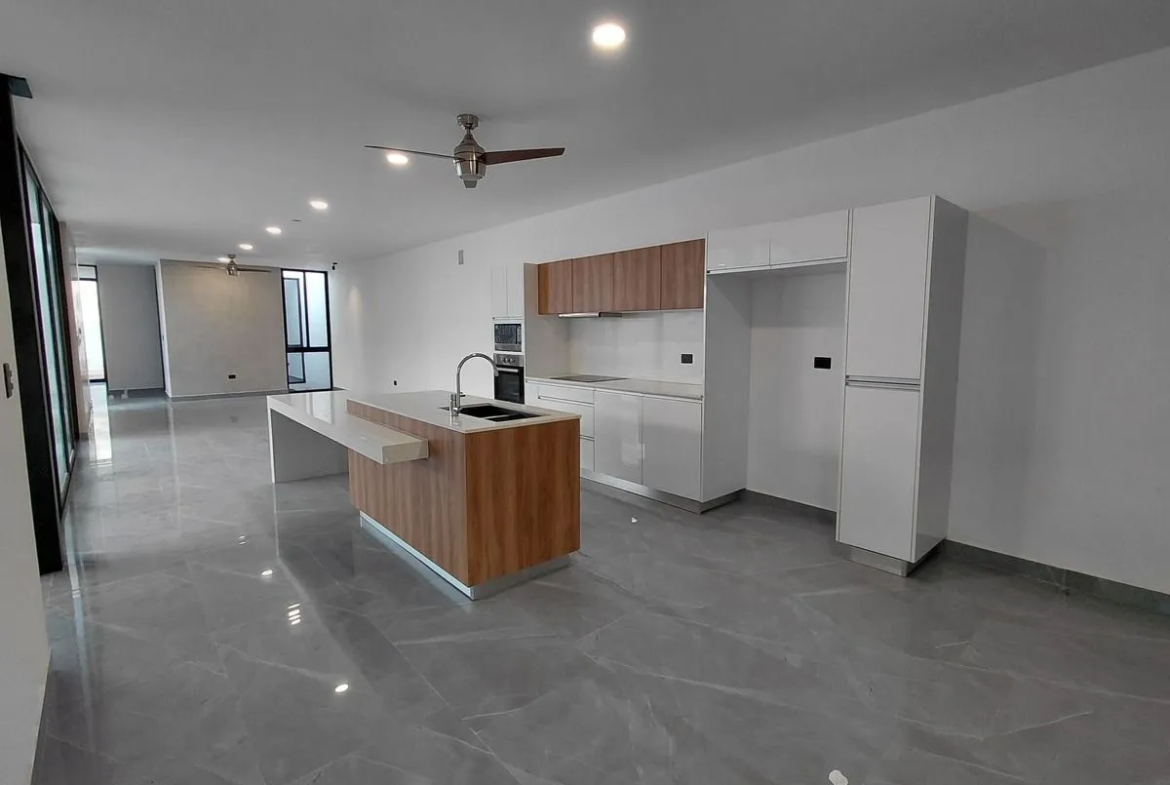 Acabados de lujo: Cocina integral de cuarzo blanco, alberca chukum