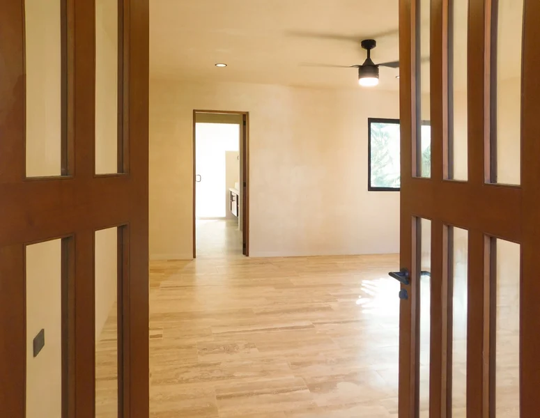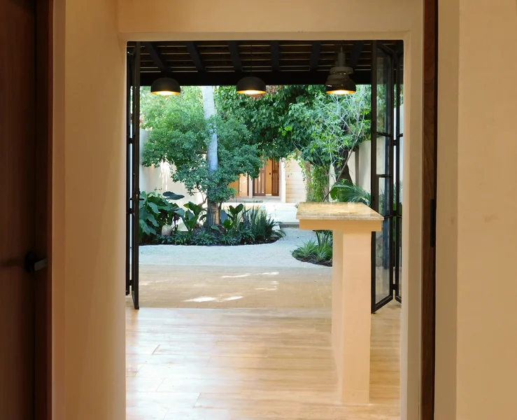 • Diseño en Secuencia: Aprovecha al máximo el terreno alargado, creando vistas profundas y continuidad entre espacios.