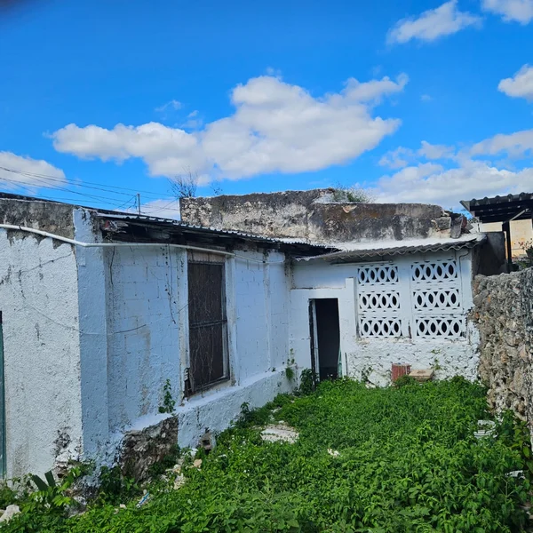 Esta casa colonial, con su fachada característica de tres puertas, ofrece un gran potencial para remodelación.